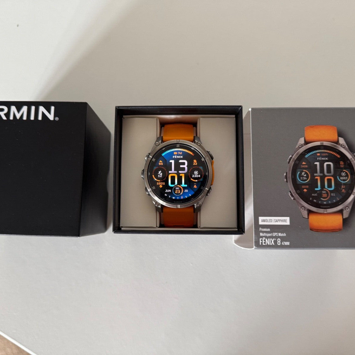 The Garmin Fenix 8 AMOLED Sapphire (47mm) is a premium multisport GPS smartwatch designed for athletes, adventurers, and professionals who demand peak performance and durability. Featuring a vivid AMOLED display, sapphire crystal lens, and a bold orange band, this model blends rugged functionality with standout style.