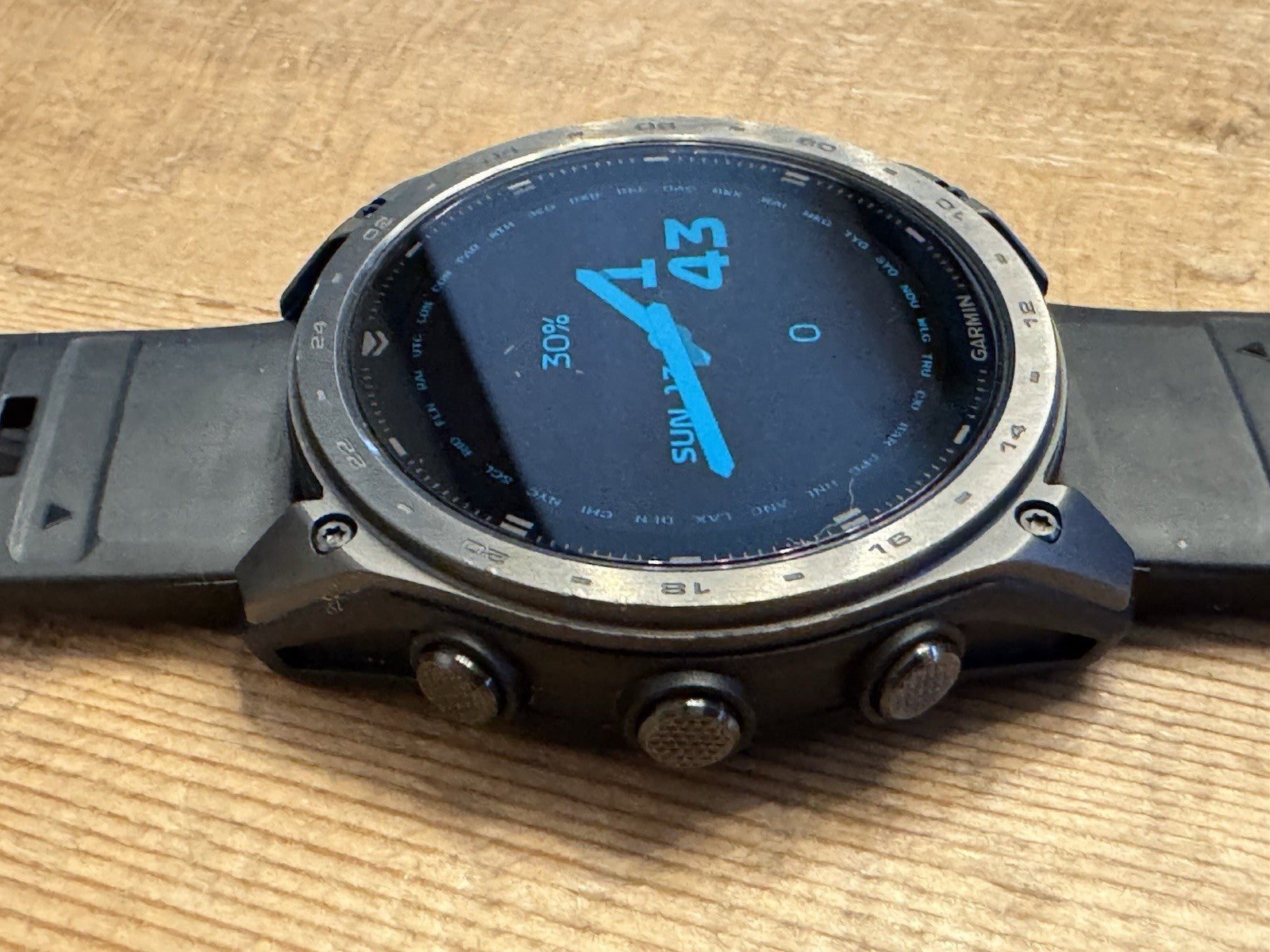 Features a durable 51mm case, AMOLED display, and black strap. The sapphire glass and band remain in flawless condition, with only minor wear visible around the bezel.